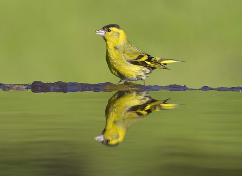 An attractive, green-and-yellow bird, the siskin regularly visits birdtables and feeders in gardens. Look for the bright yellow barring on its black wings, and the black crown of the males.