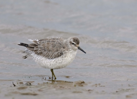 The knot is a medium-sized, short, stocky sandpiper that migrates to the UK in large numbers during winter from its Arctic breeding grounds. Commonly spotted feeding in estuaries around the coast, the largest numbers can be seen at high tide roosts in the depths of winter. A long-distance migrant, the knot can travel up to 15,000 km, stopping along the way at least once to feed. Knots eat invertebrates, molluscs and crustaceans which they find by probing their bills in the mud and sand; special sensory organs in their bill tips help them to detect buried prey in a similar fashion to the way echolocation works in bats.