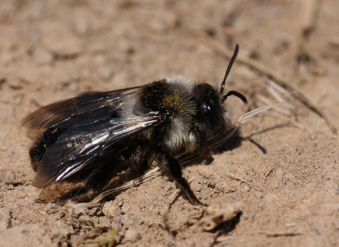 The ashy mining bee is a solitary bee, which means that female bees live alone, each creating their own nest. Ashy mining bees usually emerge in March and can be seen until June, though are occasionally seen later in the year. They can be found in a wide range of open, sunny places, from coastal grassland, moorlands and riverbanks to quarries, parks and gardens. They collect nectar and pollen from spring flowering trees and shrubs like willow and blackthorn, as well as flowers such as dandelions and buttercups.